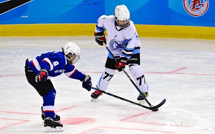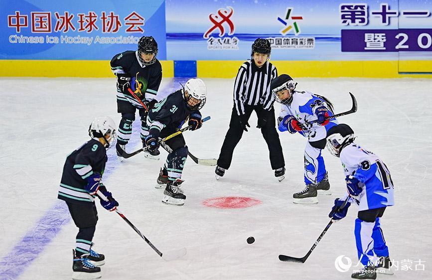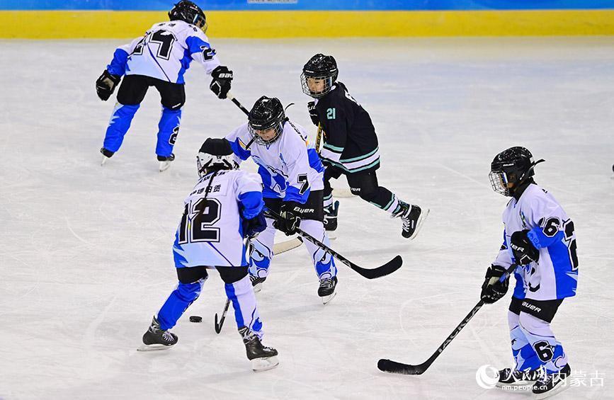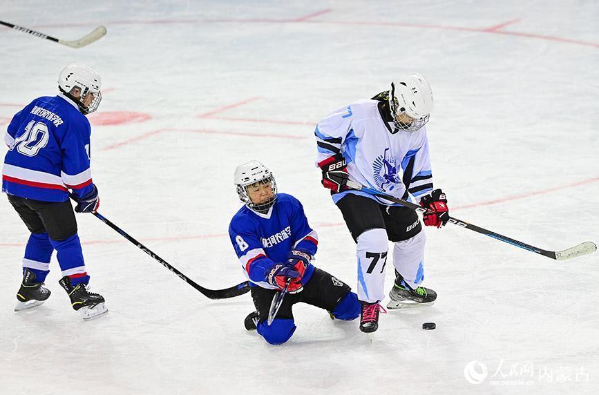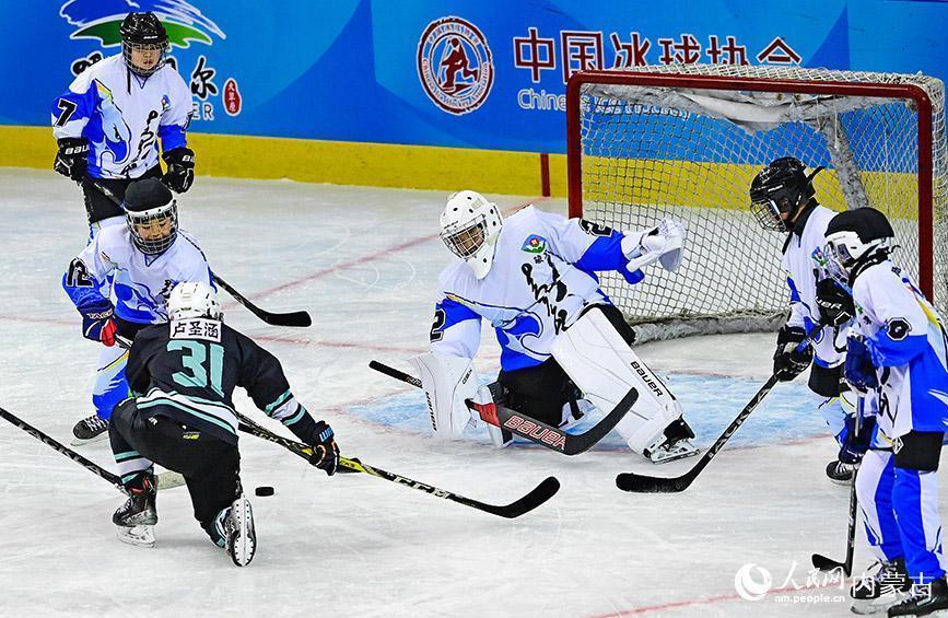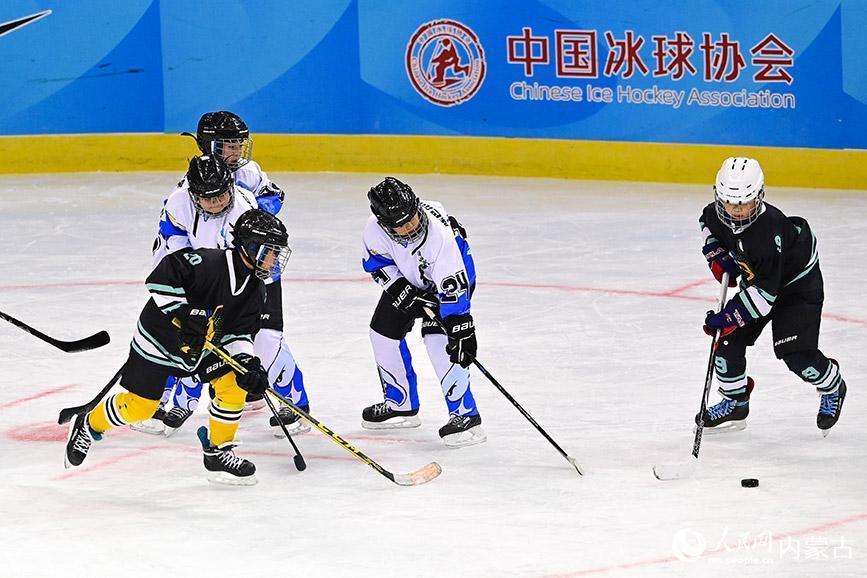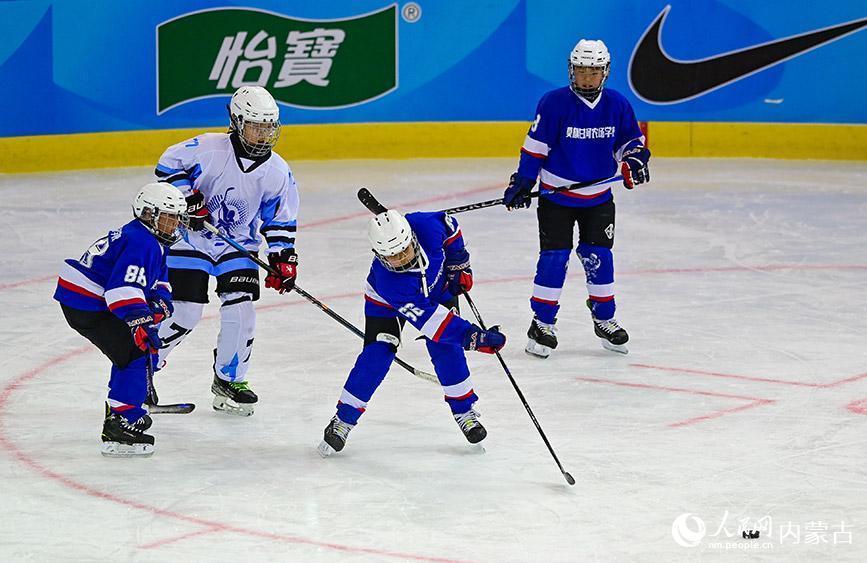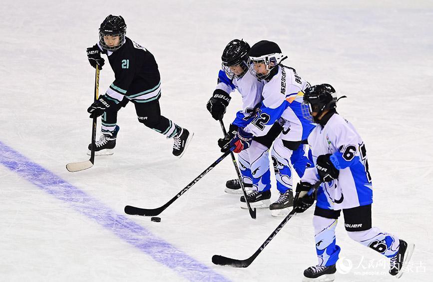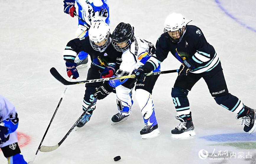 12月19日,内蒙古冰雪透露学校少年冰球队球员(玄色透露服)与陈巴尔虎旗民族小学球员在少年组比赛中争球。王正摄