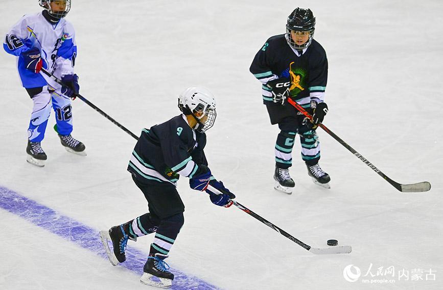12月19日,内蒙古冰雪透露学校少年冰球队球员(玄色透露服)在少年组比赛中带球。王正摄