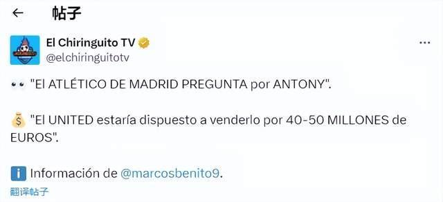 西甲名按次3的马竞,也颠倒关快慰东尼。西班牙6台记者Marcos Benito在节目中显露:马竞很关快慰东尼,并向曼联研究球员的价钱。曼联给安东尼标价4000万-5000万欧元。